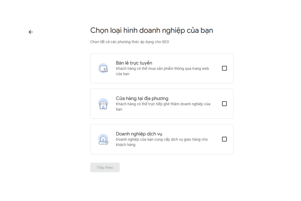 - Chọn loại hình: Có địa điểm đón khách hay chỉ phục vụ khu vực (service area business).